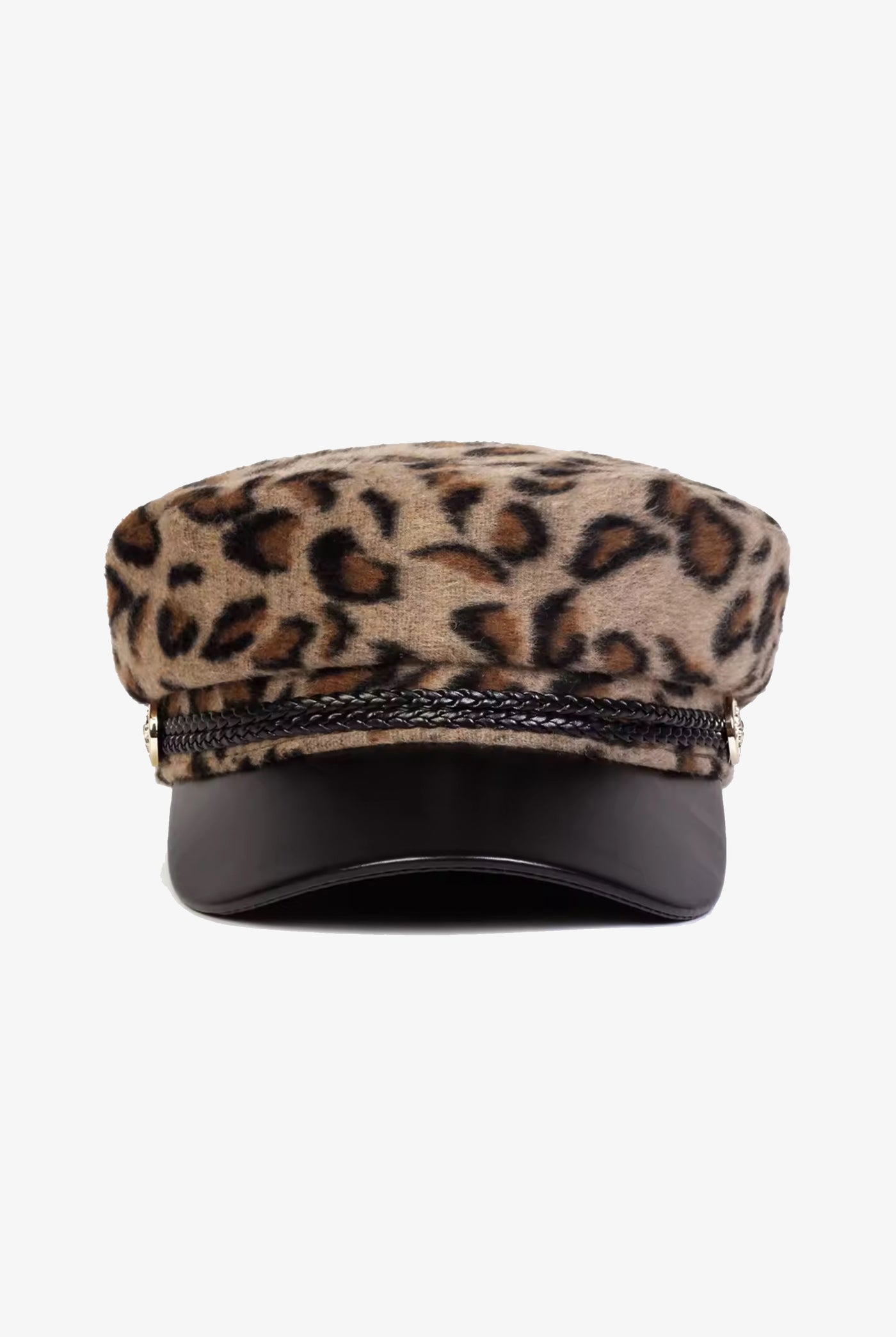 Braided Trim Faux-Leather Front Leopard Print Baker Boy Hat
